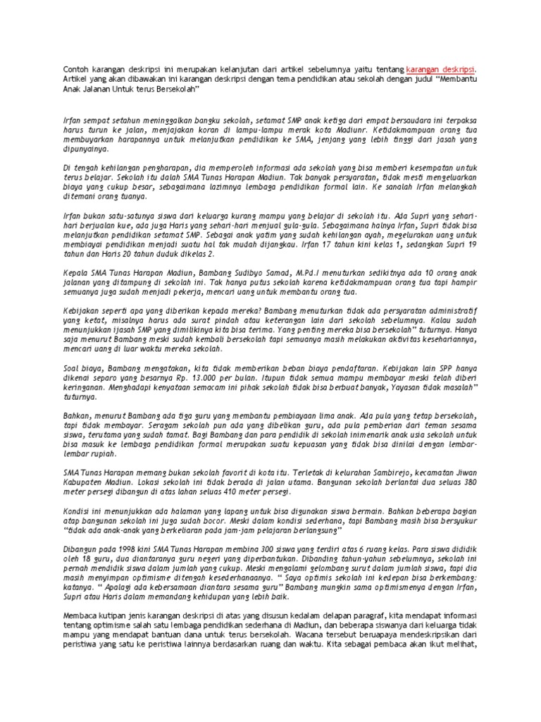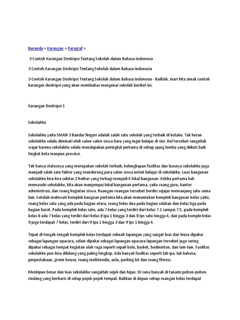 Pelajaran mengenai teks deskripsi sendiri telah kita peroleh sejak di bangku sekolah dasar. Contoh teks deskripsi dekolah baruku. Jump to contoh teks deskripsi tentang lingkungan sekitar — contoh teks deskripsi tentang lingkungan sekitar. Untuk lebih jelasnya, simak beberapa contoh teks deskripsi berikut ini. Berikut ini anda bisa melihat contoh paragraf deskripsi tentang sekolah dibawah ini: Contoh teks deskripsi tentang sekolah. Contoh teks deskripsi singkat tentang artis 4 contoh paragraf deskripsi tentang lingkungan dalam bahasa indonesia. Contoh teks deskripsi tentang rumah. Bangunan sekolah memiliki luas 2000 meter persegi dan sisa tanahnya merupakan lapangan dengan banyak. Bahkan, anda mungkin pernah membaca deskripsi tentang suatu suasana atau tempat. Tahun ini aku resmi menjadi pelajar di sebuah sekolah menengah pertama, smp laboratorium. Contoh teks deskripsi tentang sekolah contoh teks deskripsi tentang tempat wisata.