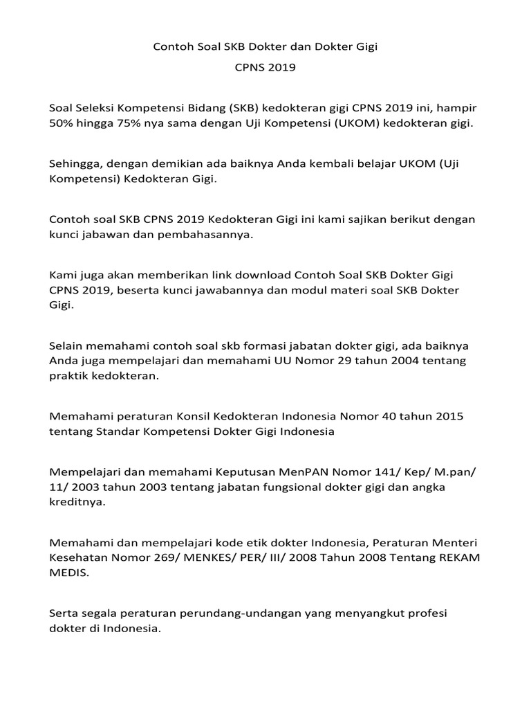 Skb Dokter Pdf Pdf Txt from html.pdfcookie.com Untuk skp awal tahun dokter pns by josepbs. Selain memahami contoh soal skb formasi jabatan dokter gigi, ada baiknya anda juga mempelajari dan memahami uu nomor 29 tahun 2004 tentang. Peserta dapat langsung mengetahui nilai hasil ujian tryout simulasi ketika selesai mengerjakan soal pada setiap materi yang telah dibahas. Hai semuanya, di video ini ngebahas fr skb kesehatan dokter umum, dokter gigi, perawat, bidan, apoteker, kesmas, gizi. Для просмотра онлайн кликните на видео ⤵. Contoh soal skb dokter gigi cpns 2019. 11:46 daftar materi belajar semoga bermanfaat!! Tanpa melupakan sisi dominan proses.