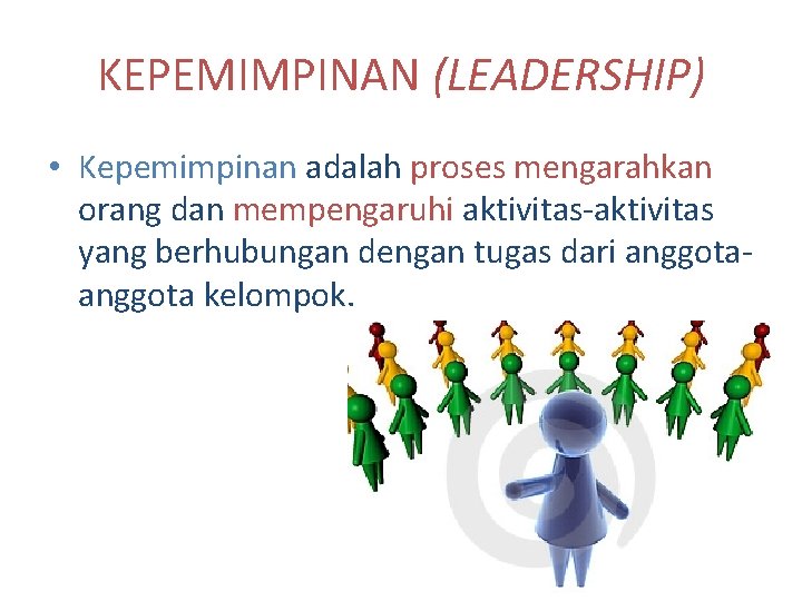 Kepemimpinan (leadership) dapat dikatakan sebagai cara dari seorang pemimpin (leader) dalam mengarahkan, mendorong dan mengatur seluruh unsur unsur di dalam . Kepemimpinan yang baik merupakan salah satu kunci keberhasilan seorang pemimpin. Hines, garry k.1991.management leadership style . Robbins (2003) mengungkapkan bahwa teori kepemimpinan yang terkait dengan eratnya hubungan atasan bawahan mengasumsikan bahwa pemimpin memperlakukan para . Pemimpin dapat mempengaruhi pengikutnya dengan cara memberi contoh.